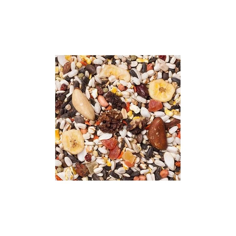 Est un mélange de haute qualité pour toutes les espèces de grands aras, microglosses, grandes perruches et perroquets (p.ex. Aratinga Guaruba) qui ont besoin d’une alimentation riche en graisse. Ce mélange contient des tournesols noirs, de grands tournesols striés et blancs et une variété de 12% de noix (noix du Brésil, noix, noix de cèdre, arachides pelées).