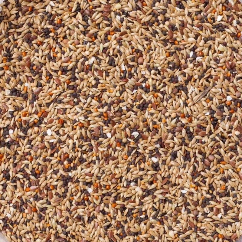 Alpistes 65%, navettes 16,1%, graines de lin 5,2%, millet rouge 2,6%, millet blanc 2,6%, panis rouge 2,6%,sarrasin 2,6%, niger 2%, graines de radis 1,3%