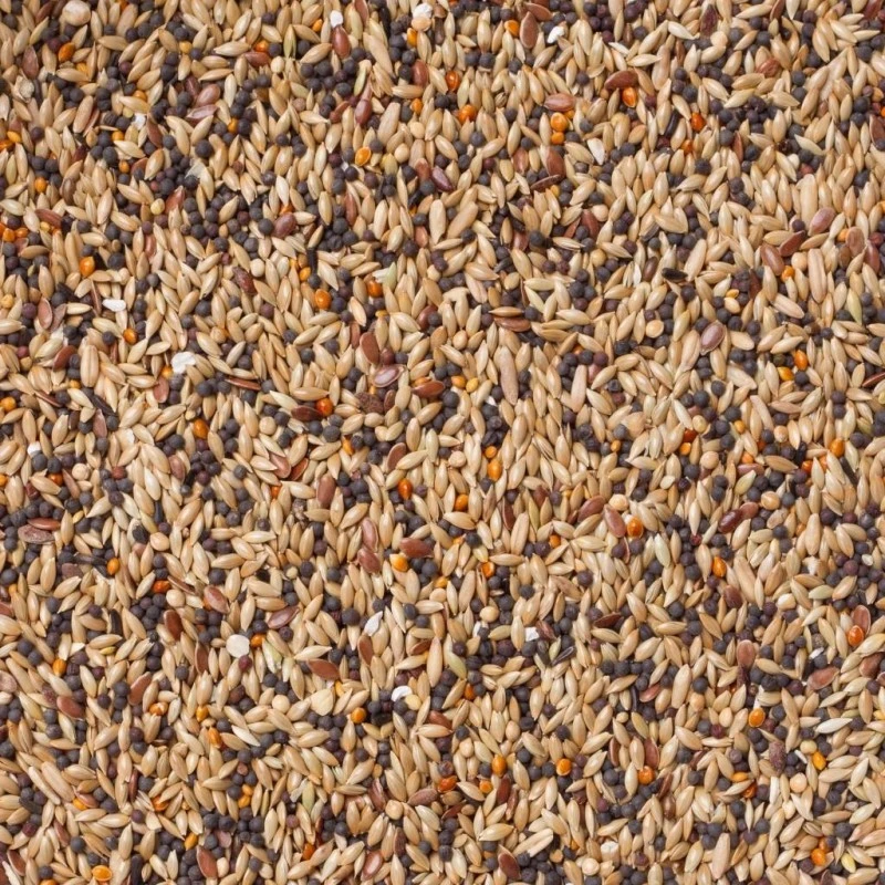 Alpistes 66,5%, navettes 11,2%, colza 8%, graines de lin 5,3%, avoine pelée 3%, panis rouge 1,3%, millet jaune 1,3%, panis rouge 1,3%, niger 1%, graines des gratteculs 0,7%, chanvre 0,4%