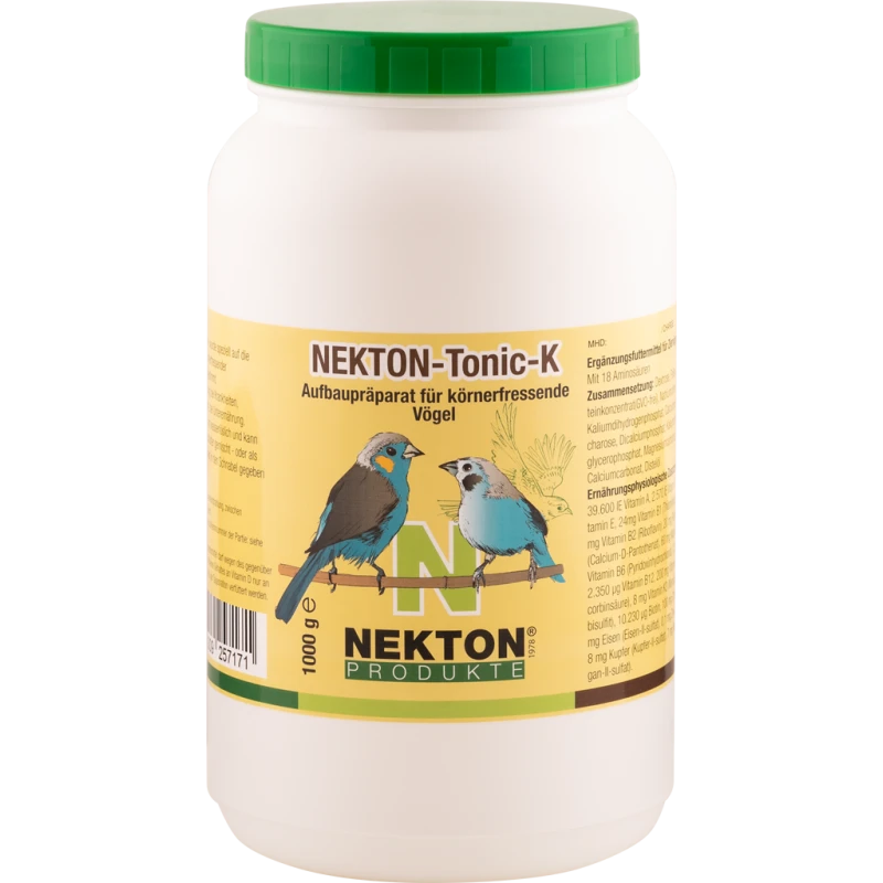 NEKTON-TONIC-K est composé de plus de 60 substances individuelles diverses, dont l’action combinée donne un aliment de synthèse et d’appoint particulièrement équilibré. NEKTON-TONIC-K a été conçu d’après les connaissances scientifiques les plus récentes des besoins nutritifs des oiseaux granivores.