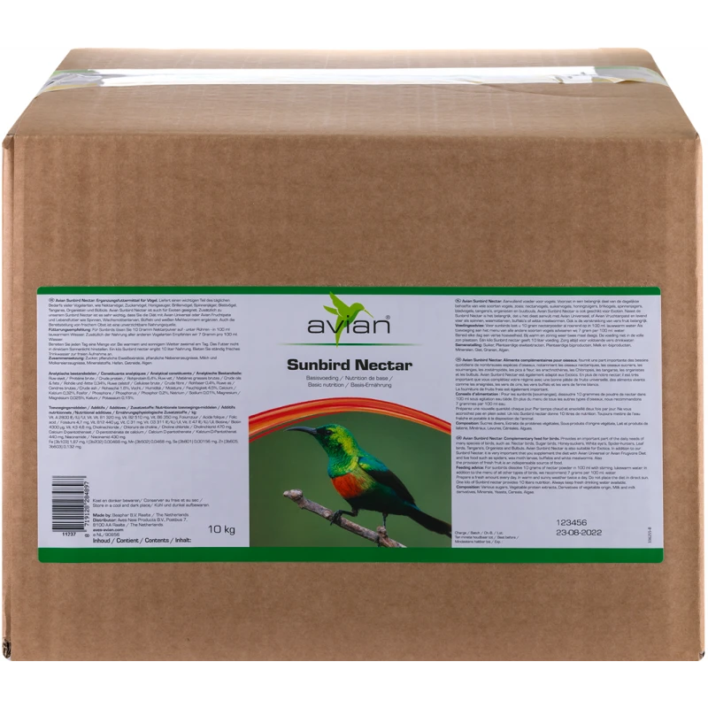 Avian Sunbird Nectar, le nectar exotique Sunbird Avian fournit une part importante des besoins quotidiens de nombreuses espèces d’oiseaux, notamment les oiseaux nectariques, les oiseaux sucriers, les souimangas, les zostéropidés, les pics à fleur, les arachnothères, les Chloropsis, les tangaras, les organistes et les bulbuls.